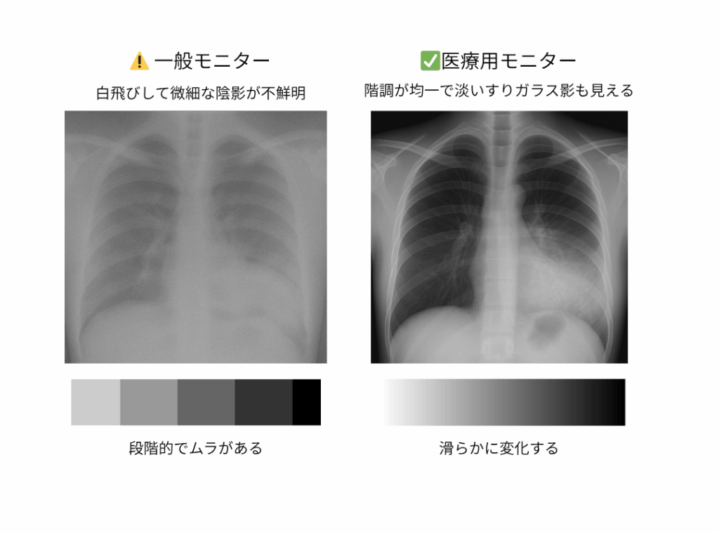 一方で、一般用モニターは写真や動画を美しく見せることには優れていますが、医療画像の読影を前提としていません。グレースケールの再現性や画面全体の均一性にばらつきがあり、経時的な変化を追う読影には不向きです。そのため、診断業務での使用はリスクを伴います。